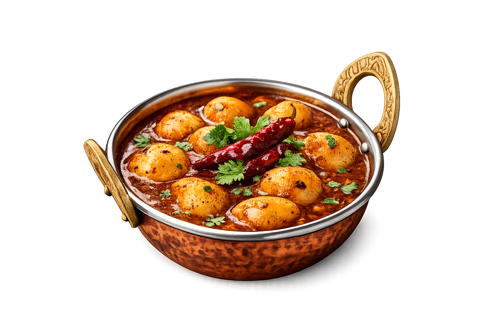 A traditional spicy potato curry infused with the rich aroma of hing and authentic Indian spices.